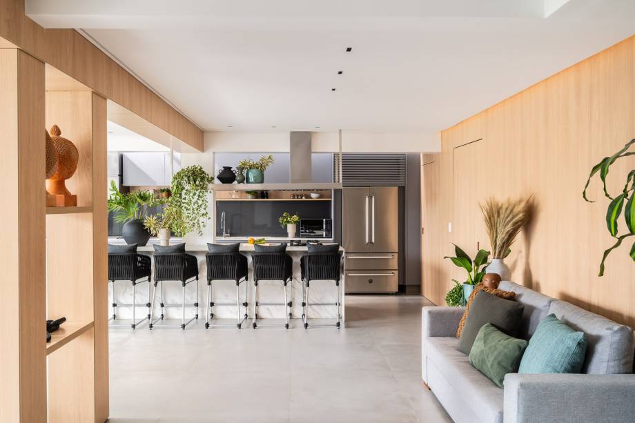 Na parte interna, a cozinha gourmet foi projetada com uma grande ilha, criando uma área bem descontraída para reunir os amigos. Uma abertura de vidro no teto aumenta ainda mais a iluminação natural.