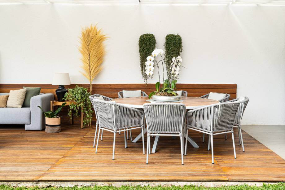 “A ligação dos espaços se dá através de um deck de um pergolado. Para trazer o estilo contemporâneo, utilizamos esquadrias de alumínio preto, bastante vidro e materiais que remetessem o concreto. Para balancear esses tons sóbrios, trabalhamos com tom madeirado claro”, explica a arquiteta.