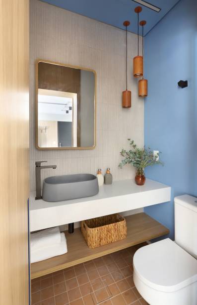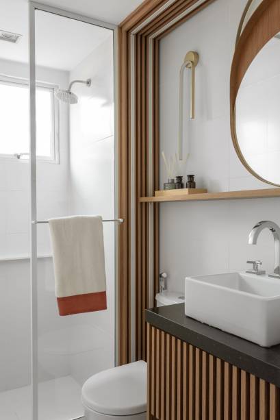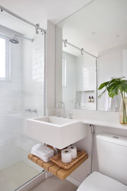 A dica ao colocar armários em banheiros pequenos é fazê-los suspensos, garantindo, assim, a sensação de amplitude. Atente-se também para o material, por ser um ambiente úmido, ele precisa ser resistente ou você terá uma peça danificada em pouco tempo.