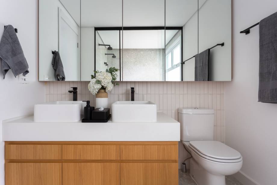 É claro que não poderiam faltar os acessórios. Organizadores podem te ajudar a arrumar a bagunça e liberar espaço, aumentando a sensação de amplitude do cômodo. Já os pequenos detalhes, como toalhas de banheiro combinando e aromatizadores, trazem charme.