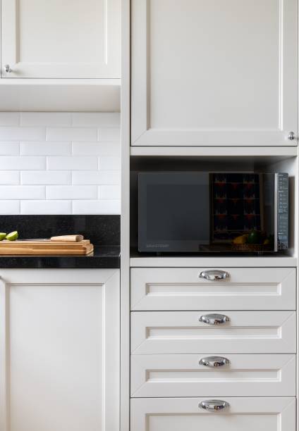 A marcenaria extensa de madeira, pintada em branco, combina com os azulejos da parede da pia – produzindo um contraste com a bancada e os eletrodomésticos em tons de preto.