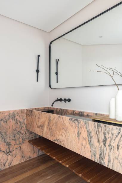 Neste projeto do Casa33 Arquitetura, o mármore é o revestimento central. Ele reveste o piso, paredes e também a cuba esculpida. Os metais pretos complementam os tons dos veios da pedra.