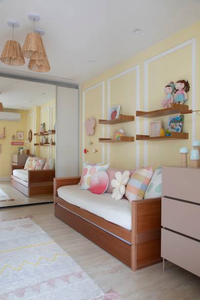 Se você é do time dos que amam papel de parede, siga o mesmo pensamento: no quarto de criança, menos pode ser mais. Estampas mais suaves e com menos elementos podem deixar o espaço mais equilibrado e acolhedor.