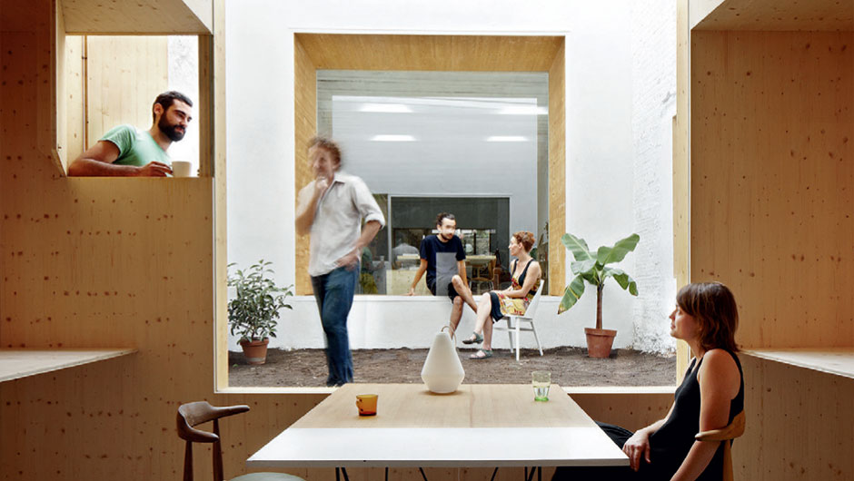 Não sobraram vestígios da velha e sombria lavanderia depois que os arquitetos Anna Puigjaner e Guillermo López a converteram num lugar; ensolarado para abrigar a nova sede de seu escritório, o MAIO, em Barcelona. Munidos de boas ideias, numa tacada deram cabo de dois problemas – o orçamento enxuto e o terreno estreito (5 x 40 m). Singela porém eficiente, a solução foi abrir um pátio interno no meio da obra, em quase toda a largura do lote, a fim de conquistar iluminação natural. As janelas do salão de trabalho, de 120 m², voltam-se para o precioso quintal, que virou ponto de relax da turma. A ala da frente se dedica a mostras e workshops do estúdio de design, e todos os espaços são acessados pelo corredor lateral. “Nosso objetivo era enfatizar a noção de uma experiência coletiva”, revela Guillermo.