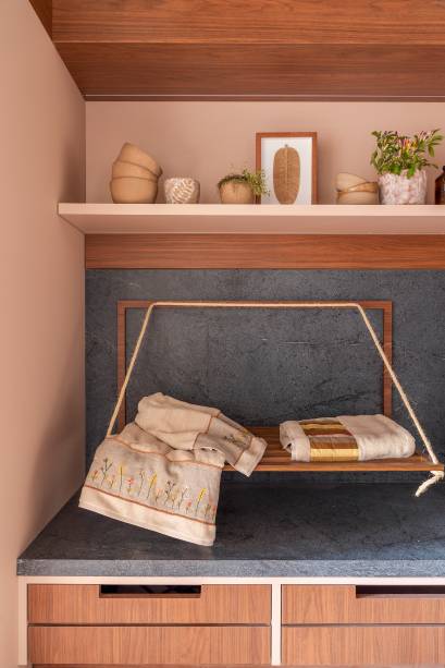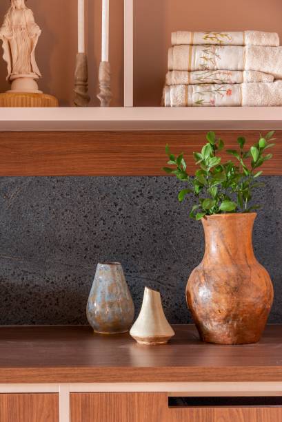 O cômodo também destaca a riqueza visual e sensorial dos elementos tradicionais, como bordados, tecelagem, cerâmica e cestarias. A naturalidade de materiais também pode ser notada no piso, com diferentes tonalidades que remetem ao tijolo, e no revestimento da parede, que destaca uma estética rústica.