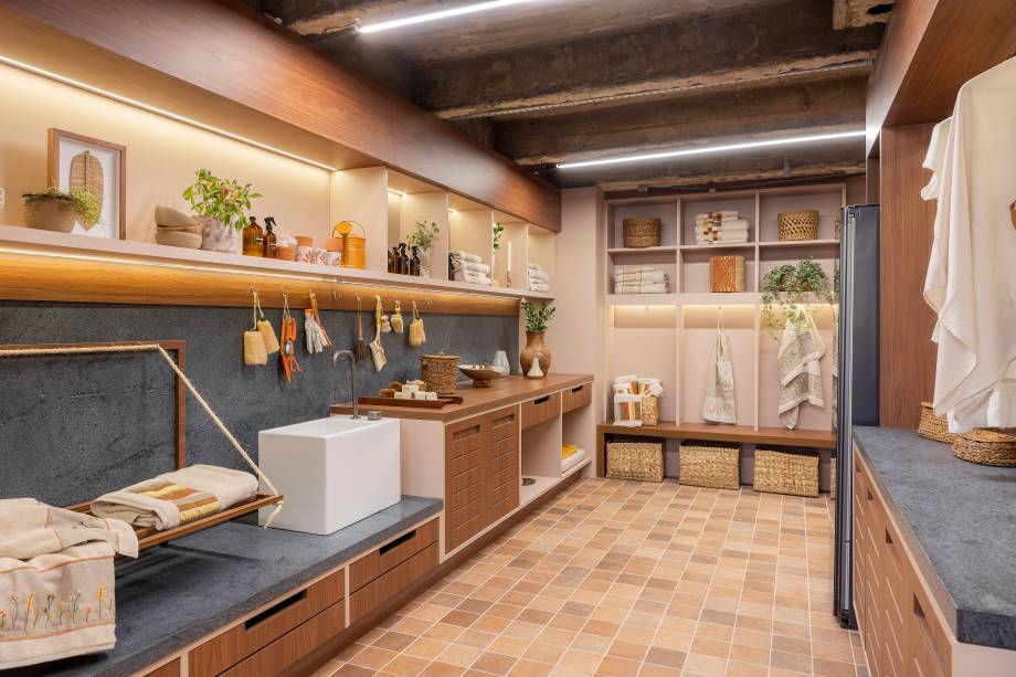 A marcenaria minuciosamente planejada, delineia toda a lavanderia em suas diferentes atividades e auxilia na organização dos itens. A iluminação LED adiciona um charme e valoriza os objetos decorativos.