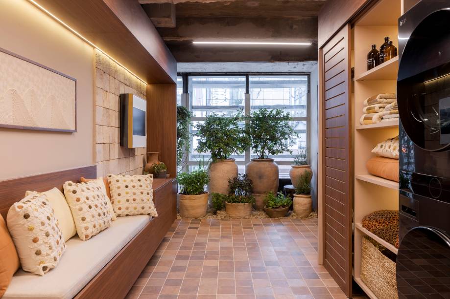 As espécies cultivadas em grandes vasos cerâmicos remetem a um local de descompressão, refúgio e conexão, tal qual em tempos atrás. E para incentivar a permanência e o bem-estar enquanto as roupas estão na máquina de lavar, um sofá com almofadas ornamentadas com fuxicos foi adicionado.