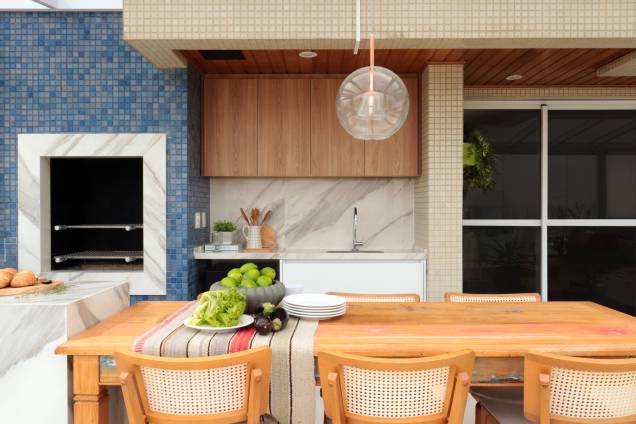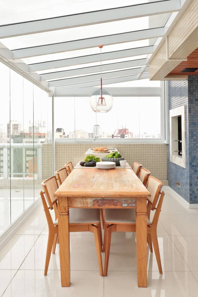 Da mesma forma, o tecido que reveste as cadeiras deve ser resistente à água e protegido contra os raios solares. “No tocante à iluminação, sempre conferimos com as normas do edifício o tipo de luz e acessórios que devem ser especificados na varanda”, completa.