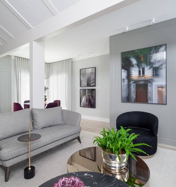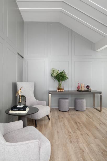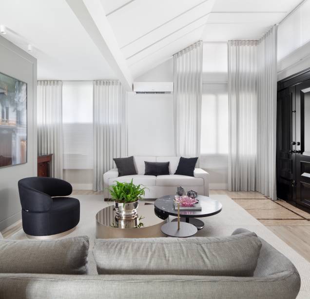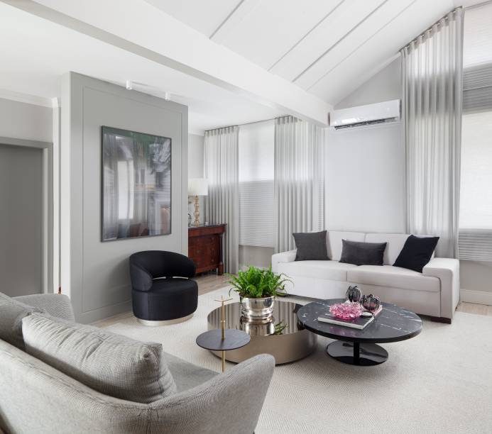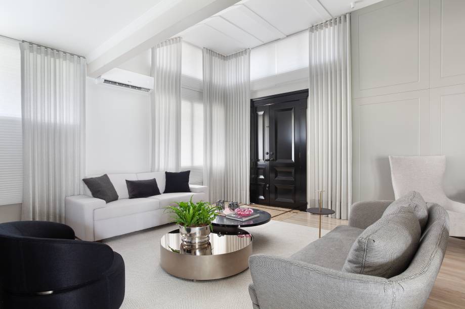 Uma família com 2 filhos buscava uma sala mais intimista e aconchegante para se reunirem em casa. Eles chamaram a arquiteta Carla Bertuol para criar um projeto sofisticado, no estilo neoclássico, para o living de 79m².