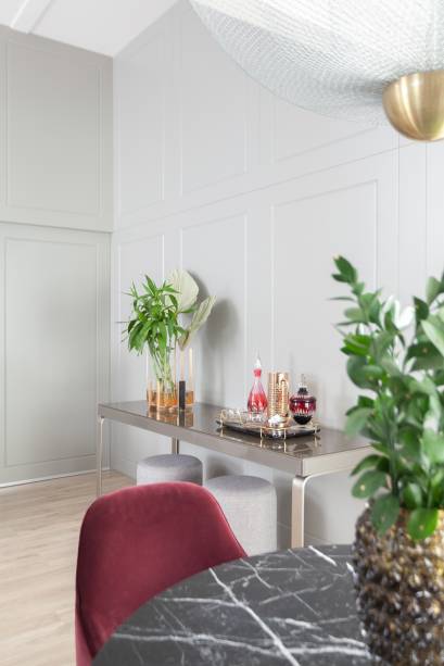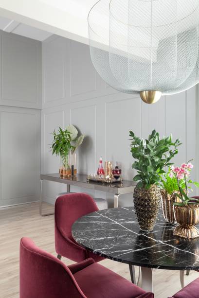 Como o uso de pedra era um desejo dos moradores, a profissional incluiu mesas de centro e refeição em mármore além de painéis em laca. Fotografias de Fernanda Namam e um lustre completam a atmosfera.