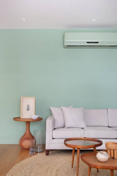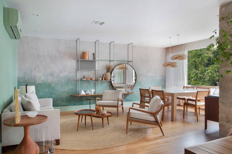 Os móveis novos seguem o mesmo conceito: texturas, formas orgânicas e cores que remetem à natureza, em tons de terracota, areia, verde e azul. Entre as peças de design assinado, a arquiteta destaca as mesas de centro e a mesa lateral do Estudiobola. Já no quesito “revestimentos”, a cereja do bolo é, sem dúvida, o papel de parede com efeito degradê envelhecido, replicado nos ambientes de tv, estar e jantar.