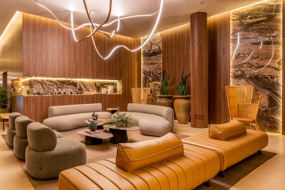 “Utilizamos pedras com diferentes tons, que refletem nossas emoções diárias, assim como os veios entrelaçados que representam a complexidade dessas emoções. A presença da madeira estabelece uma ligação com a natureza, criando uma atmosfera serena e acolhedora que convida à descontração e ao deleite do ambiente. A seleção dos móveis foi feita com foco no conforto, optando por linhas orgânicas que conferem leveza e movimento ao espaço”, conta Letícia.