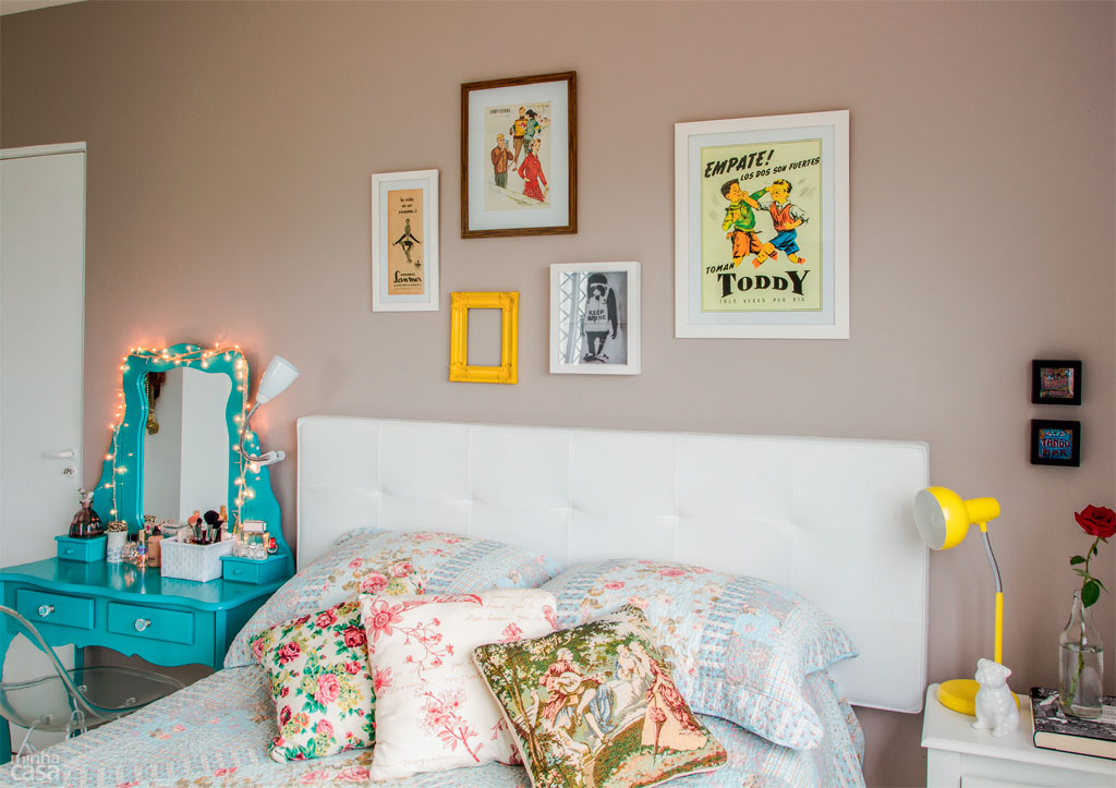 “Adoramos ficar em casa, por isso nosso desejo é que os ambientes sejam muito aconchegantes e reflitam nossa personalidade. Para imprimir essas características no quarto, fiz várias pesquisas e garimpei bastante até definir os detalhes que queria. Tudo começou quando navegava na internet em busca de referências e me deparei com penteadeiras coloridas de estilo vintage. Não deu outra: eu me encantei e decidi que precisava de uma. Saí em busca da peça e logo achei esta azul, como eu sonhava – só aí a ambientação ganhou forma. Já que o tom era forte, deixei que o móvel reinasse absoluto, pintando as paredes em uma cor suave para destacá-lo. O toque final são os elementos em amarelo e o enxoval, que pode sempre mudar.”