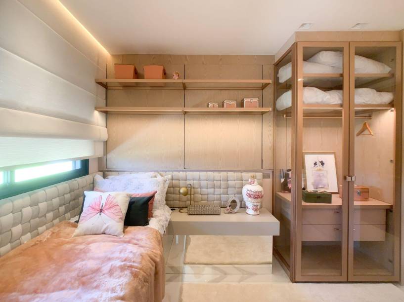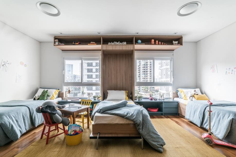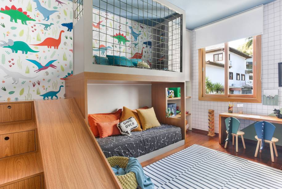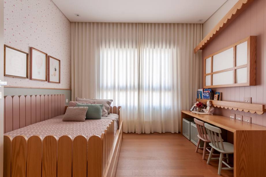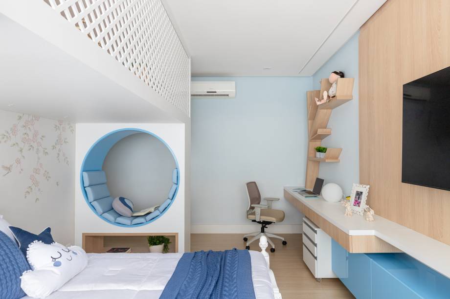 “Caso a criança já esteja em idade escolar, crie uma área de estudos confortável e bem iluminada para ela, com direito a uma mesa, cadeira e prateleiras. Se o espaço para o quarto for pequeno para incluir uma cama + armário + área de estudos, opte por uma marcenaria personalizada que inclua um projeto 2 em 1 com cama + escrivaninha acoplada”, sugere a arquiteta.