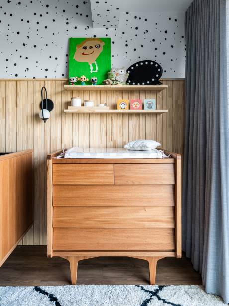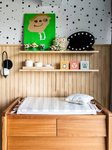 A escolha pelo uso da madeira pinus, mais clara e natural, foi fundamental para refletir aconchego e não pesar o cômodo. O material foi utilizado no berço, trocador – os dois da Ameise Design -, beliche e detalhes na parede. No piso, boa parte da superfície foi coberta por um tapete que segue a paleta do ambiente.
