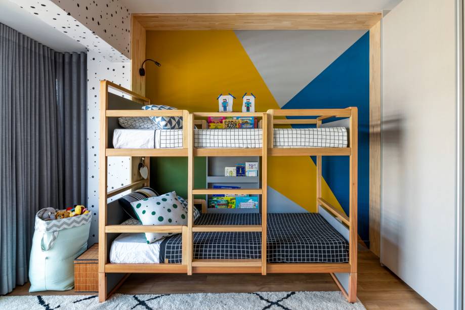 Já na parte dos meninos, a parede recebe um efeito com formas geométricas em amarelo, verde, azul e cinza. Acompanhando o mesmo padrão, os jogos de cama dão personalidade para o ambiente.