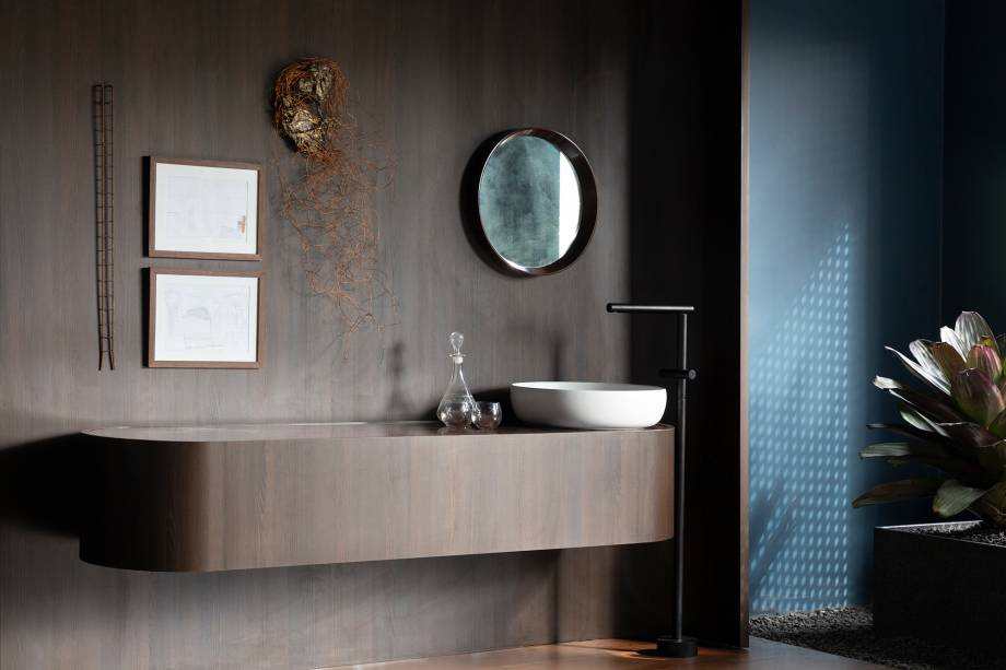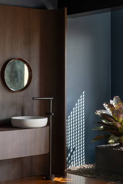 Projeto do arquiteto Eduardo Franco Correa, da EFC Arquitetura, para a CASACOR Ribeirão Preto 2023, o Oceano Deca foi criado como uma área de relaxamento e introspecção para o uso coletivo em uma residência. Para criar esse “jeitinho de casa”, o escritório usou materiais naturais, como o piso em assoalho de madeira, que traz aspecto escuro ao ambiente e conforto ao toque, além de pedriscos que reforçam o caráter orgânico do espaço e completam o entorno do box.