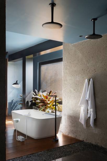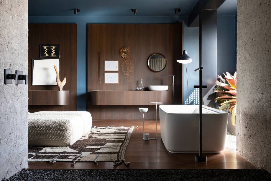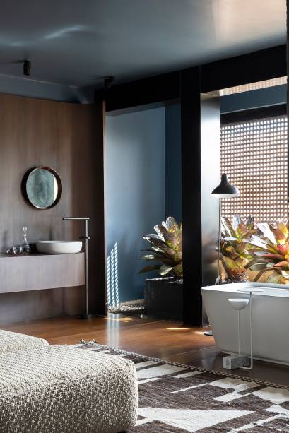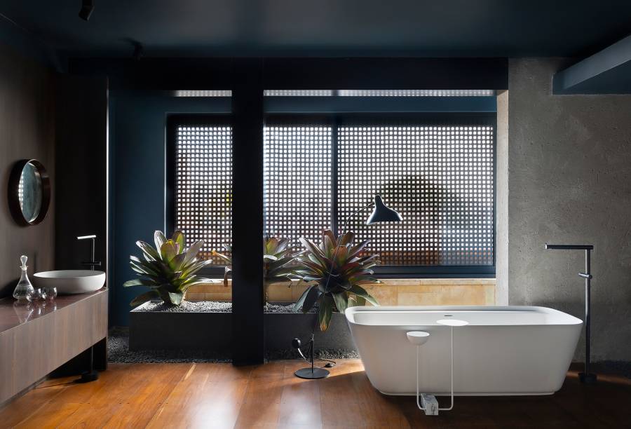 Uma banheira de imersão foi instalada próxima a janela que recebe luz filtrada pelo muxarabi. Ao centro, dois sofás Dobra, do Estúdio Guilherme Wentz, assumem o protagonismo no mobiliário, que também conta com peças do Estúdio Rain e Estúdio Manus.