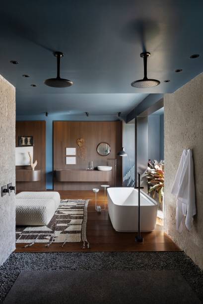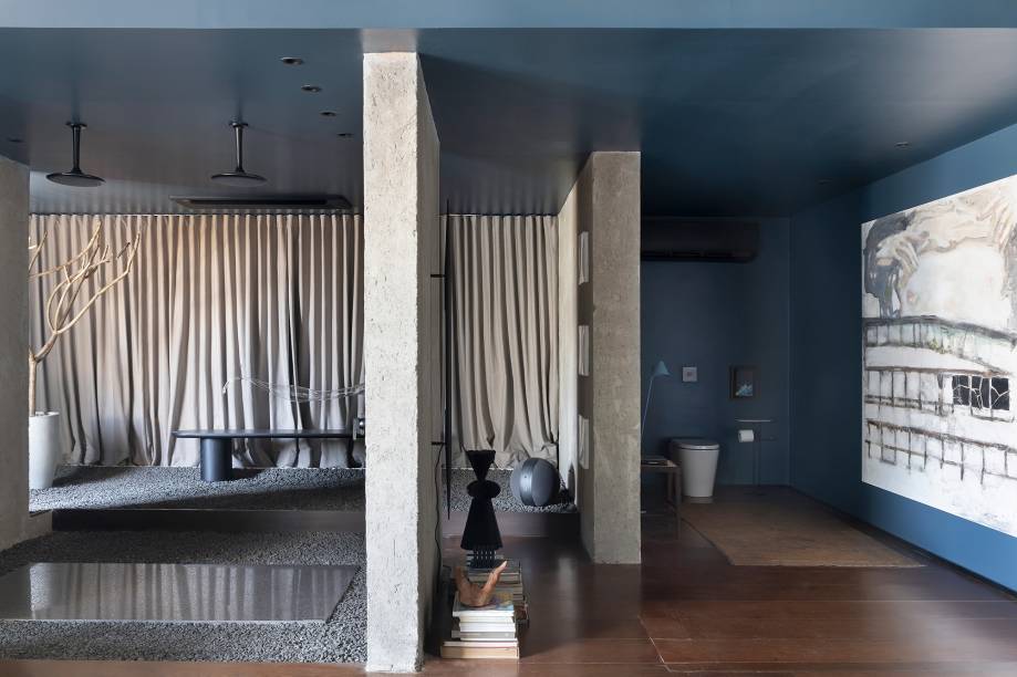 Remetendo ao elemento “água”, a cor azul aparece nas paredes e no teto e as curvas da marcenaria reforçam a sensação de fluidez ao espaço.