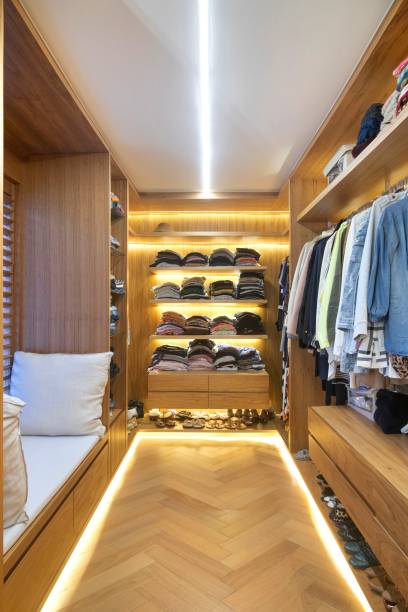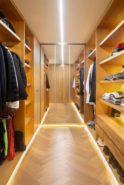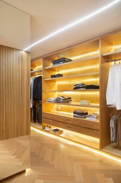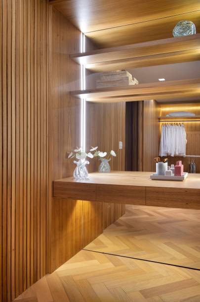 “Eles queriam uma suíte master com cara de hotel cinco estrelas, além de um closet bem espaçoso ligado ao quarto, com um lado para cada um”, conta Raposo. “O lado dela ganhou ainda uma bancada confortável, que serve de apoio para maquiagem”, acrescenta.
