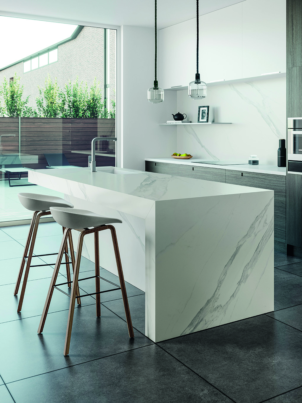 Com visual marmorizado, o Dekton Opera (composto ultrarresistente de vidro, porcelana e quartzo), da Cosentino, lembra o carrara com acabamento mate chamado de Velvet Texture.