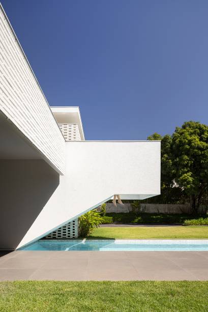 Tijolos brancos compõem a fachada vazada desta casa de 600 m² em Brasília