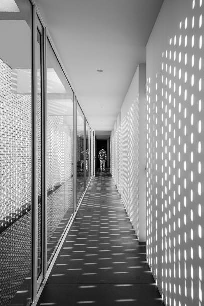 Seus diferentes graus de abertura são formados pelo espaçamento variável entre os tijolos. O nível de visibilidade através dos tijolos reflete os diferentes níveis de privacidade que são desejados para cada ambiente interno. Os blocos possuem tamanhos alongados, fora do padrão do mercado, encomendados especificamente para essa obra.