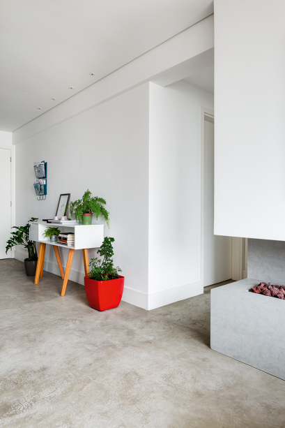 A churrasqueira, no canto da sala, é valorizada pelo cimento queimado (Tecnocimento, da NS Brazil) aplicado na divisória. Confira as outras boas ideias desta proposta do escritório ILLA nesta reportagem. (Foto: Marcelo Donadussi)