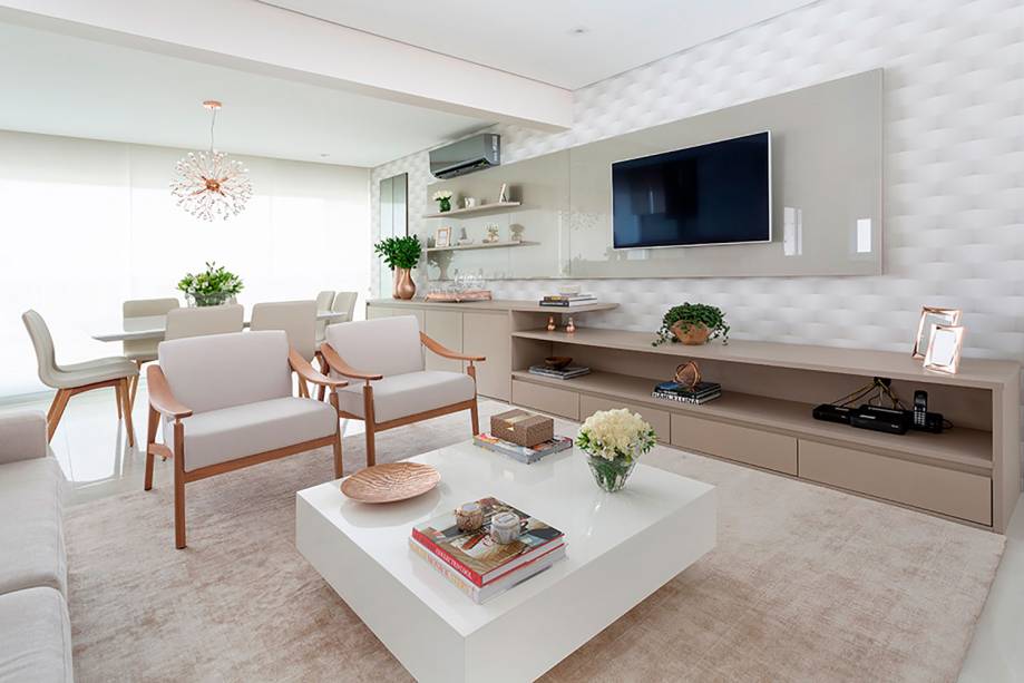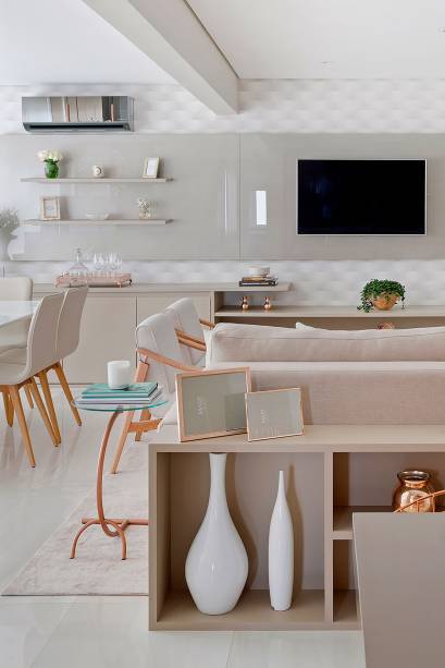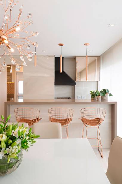 O apartamento de 110m² foi desenvolvido para um jovem casal com uma filha pequena. Com um estilo contemporâneo, a profissional buscou inspiração nos tons claros, para proporcionar ambientes leves e aconchegantes, tons de bege e detalhes em cobre para iluminar o ambiente.