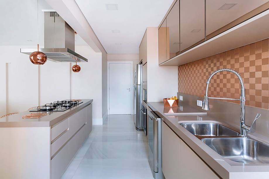 A cozinha é um detalhe a parte. Ela se destaca por ser o ponto principal do projeto, com uma ilha central para o preparo da comida. Além disso, os revestimentos, detalhes e luminárias em bronze, trazem todo o charme para o espaço.