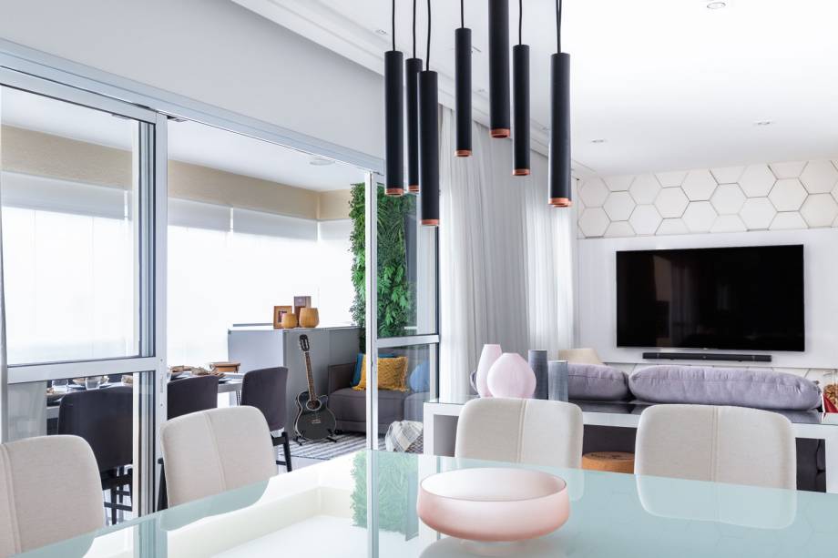 Já a sala de TV possui um décor bem clean, com tons claros. Para destacar o grande televisor, foi inserido um revestimento hexagonal 3D e um painel laqueado com iluminação indireta.