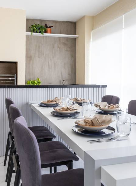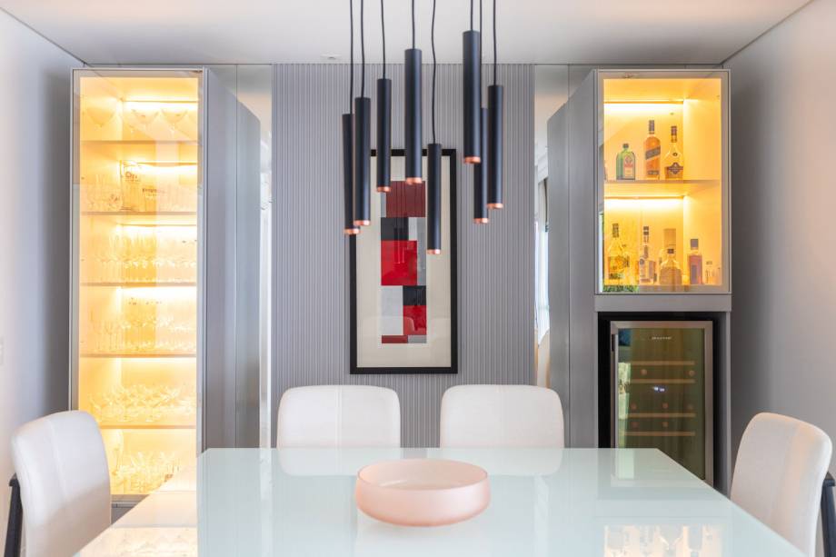 A estrela da casa, a varanda, recebeu uma churrasqueira para os encontros com amigos e familiares. No ambiente, também, foi inserida uma mesa móvel, para que seja mudada de posição e colocada duas banquetas de apoio na ilha, com o intuito de receber mais pessoas. Para iluminar esse ambiente mas sem limitar o seu uso – já que pendentes poderiam demarcar a posição da mesa – foi criado um design com luminárias de sobrepor de diversos tamanhos sobre o móvel, formando uma luminária única.