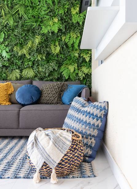 Para complementar o clima aconchegante do espaço, a varanda recebe uma parede verde com sofá cheio de almofadas.