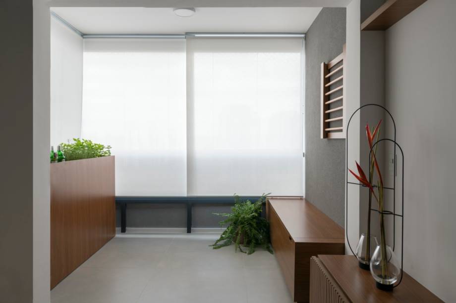 Na varanda, mais um truque para aproveitar bem cada centímetro. O banco baú continua junto com uma marcenaria que foi desenhada pelos arquitetos para esconder a máquina do ar-condicionado, servindo também para plantar a horta do casal e o barzinho.