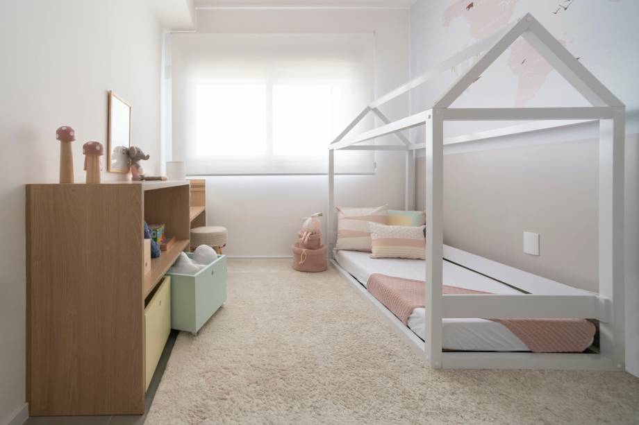 Para os quartos de casal, os arquitetos desenharam um armário com nicho embutido que serve de mesa lateral de um lado da cama. E do outro, um móvel par servir de home office. No quarto de Laurinha, um mapa-mundi estampa o papel de parede e móveis baixos garante mais autonomia para a pequena.