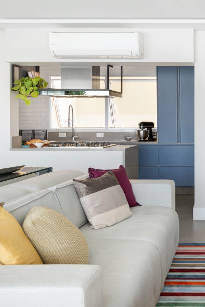A cozinha americana, aberta para a sala de estar, foi toda revestida com subway tiles brancos e ganhou certo ar industrial com a bancada cinza e prateleira suspensa de serralheria que apoia a coifa de inox. A marcenaria azul se destaca entre os elementos de tons neutros.