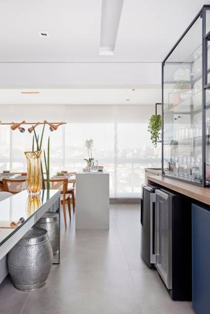 A varanda, com churrasqueira e espaço gourmet, foi toda aberta para o living e a cozinha americana. A cor branca, predominante nas paredes, ajudou nessa sensação de integração e claridade, assim como o piso de porcelanato no tom de cimento. Já a marcenaria bem planejada e os revestimentos de parede ajudaram a setorizar os espaços.