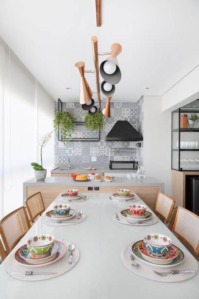 Repare que na área da churrasqueira, a parede foi toda revestida com ladrilhos hidráulicos em tons de cinza, puxando para um azul clarinho. Tons de azul, aliás, que aparecem também na marcenaria em outros ambientes e foram escolhidos por remeterem à memória afetiva da moradora. Ela queria que alguns elementos lembrassem Portugal, uma terra querida. Os pratos de cerâmica que trouxe do país ganharam, então, lugar de destaque na parede onde foi instalada a adega, com prateleiras de serralheria.