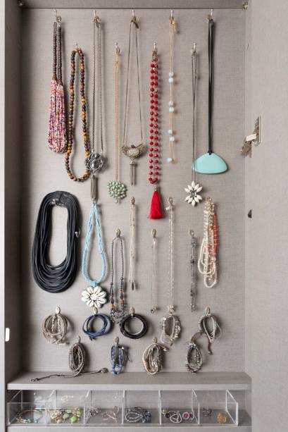 Um terceiro quarto do apartamento foi anexado à suíte master para se tornar o closet do casal. Além disso, as arquitetas desenharam uma penteadeira com espelho embutido no tampo, onde a moradora pode se maquiar e também usar o móvel como home office. Nos armários, alguns espaços foram criados especialmente para que joias e bijuterias pudessem ser armazenadas de forma organizada.
