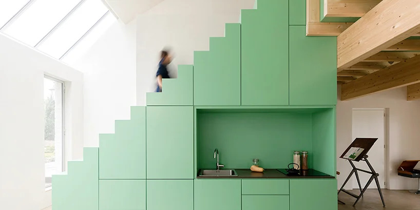 Os arquitetos preservaram as grandes aberturas do ateliê, de forma a garantir que a luz natural do sol permeasse o interior. Enquanto isso, uma escada verde vibrante permite que os ocupantes acessem o segundo andar, ao mesmo tempo que acomoda uma série de armários de armazenamento.