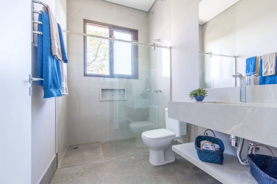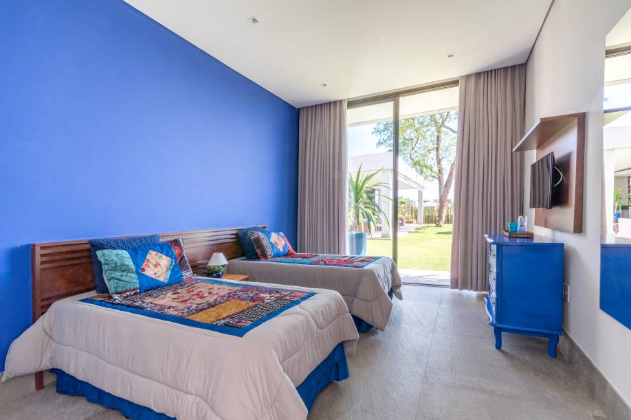 Por fim, os detalhes em azul se estendem para alguns dos quartos de convidados e suítes da residência, contribuindo assim para um ambiente leve e de muito relaxamento.