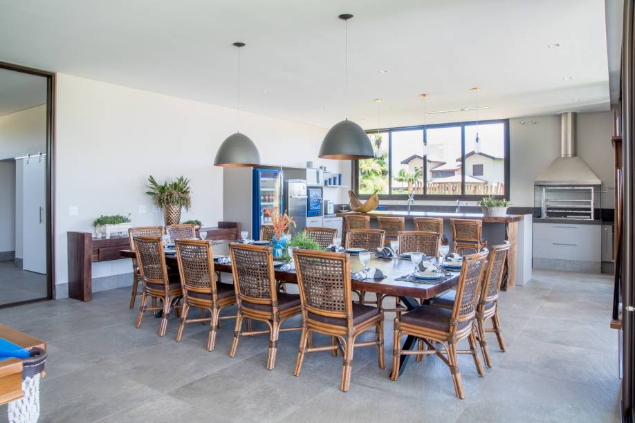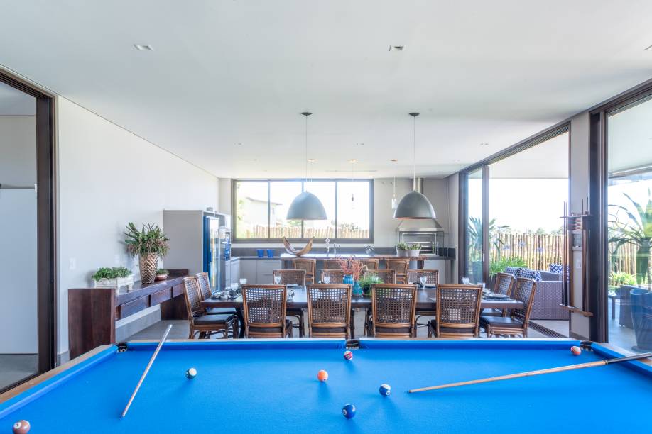 Um outro ponto forte do projeto é a integração da área social. Por exemplo, a varanda – um dos espaços mais frequentados da casa – está totalmente conjugada à mesa de jantar, ao balcão de refeições rápidas, à mesa de bilhar, à churrasqueira, à cozinha e à copa.