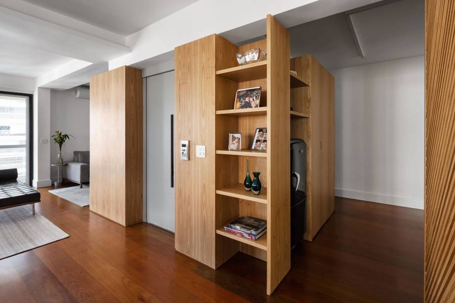 Partindo do princípio que o imóvel não possuía hall social, todo o projeto foi moldado ao redor da caixa do elevador, sendo ela também o destaque. “Retiramos as paredes, integramos os espaços e destacamos esse corpo, dando a ele uma função multiuso em uma composição com armários, painéis, rack e estantes por toda a sua volta. O desenho da nova caixa de madeira é reforçado pelas vigas, agora aparentes, com a retirada das paredes. Toda a marcenaria é limitada pela altura da viga”, explicam os profissionais.