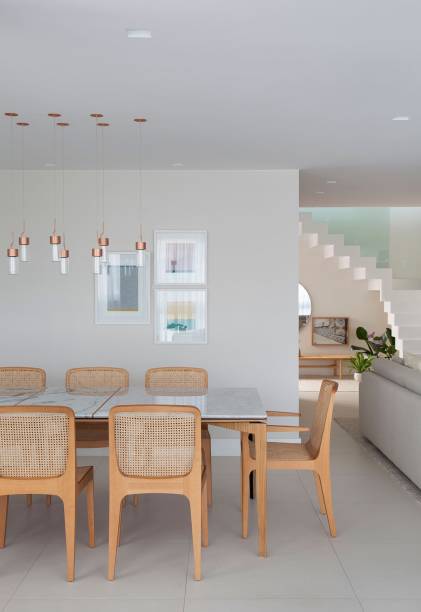 Pode parecer diferente, mas o pedido que estava no topo da lista dos moradores era ter uma linda escada do acesso à cobertura pela sala principal. Dada a importância, ela tornou-se o destaque do projeto. A escada foi revestida com quartzo branco, recebeu corrimão embutido de freijó com design limpo, contemporâneo e linhas retas.