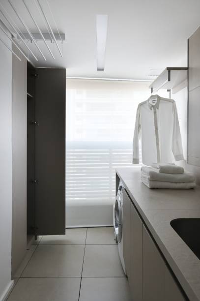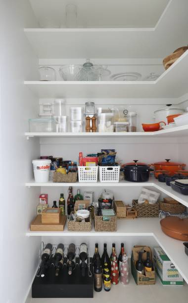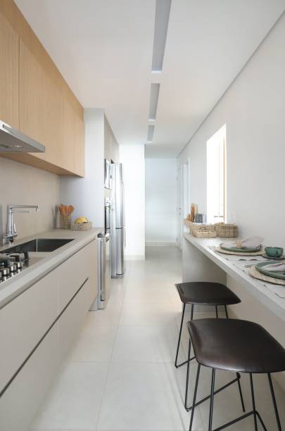 No hall, por exemplo, a porta do elevador ficou escondida. No living, o painel de marcenaria reveste o núcleo rígido do edifício com a porta de entrada, televisão e bar de apoio. Já na sala de jantar, que fica na varanda, a marcenaria inteligente transforma o ambiente. Para jantares formais, a churrasqueira e a cuba são tampadas e se camuflam ao nicho do armário. Em dias de churrasco, as tampas saem e a churrasqueira se encaixa.