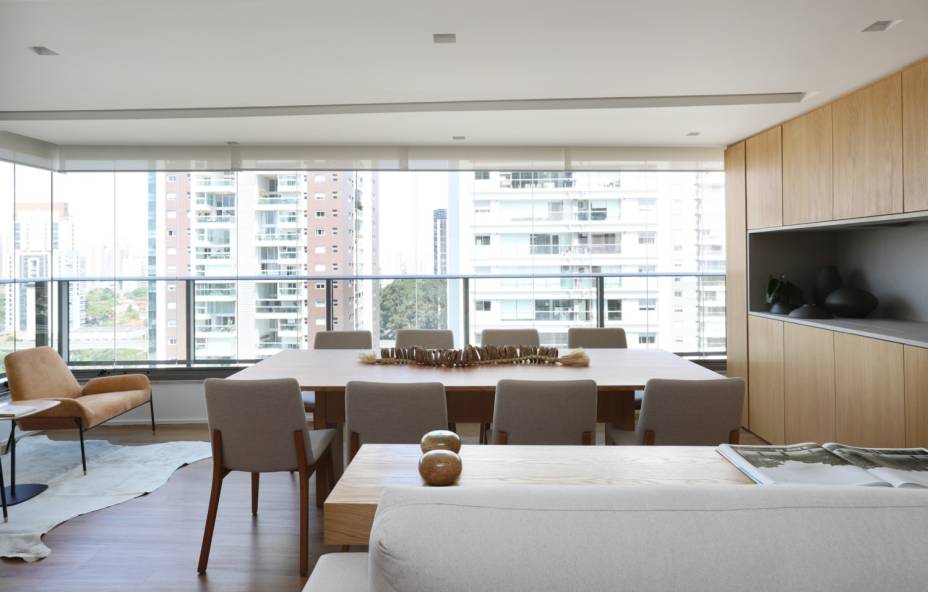Um pedido especial do casal era manter a churrasqueira na varanda, mas, desde que ela não ficasse aparente. A ideia era poder receber os amigos e a família para jantares formais e almoços descontraídos no mesmo espaço. Para atender a esse desejo, as arquitetas criaram um espaço flexível, que atende às duas ocasiões.
