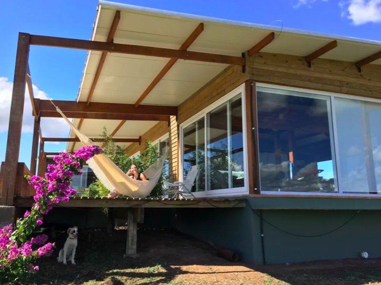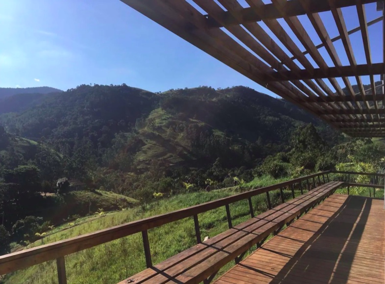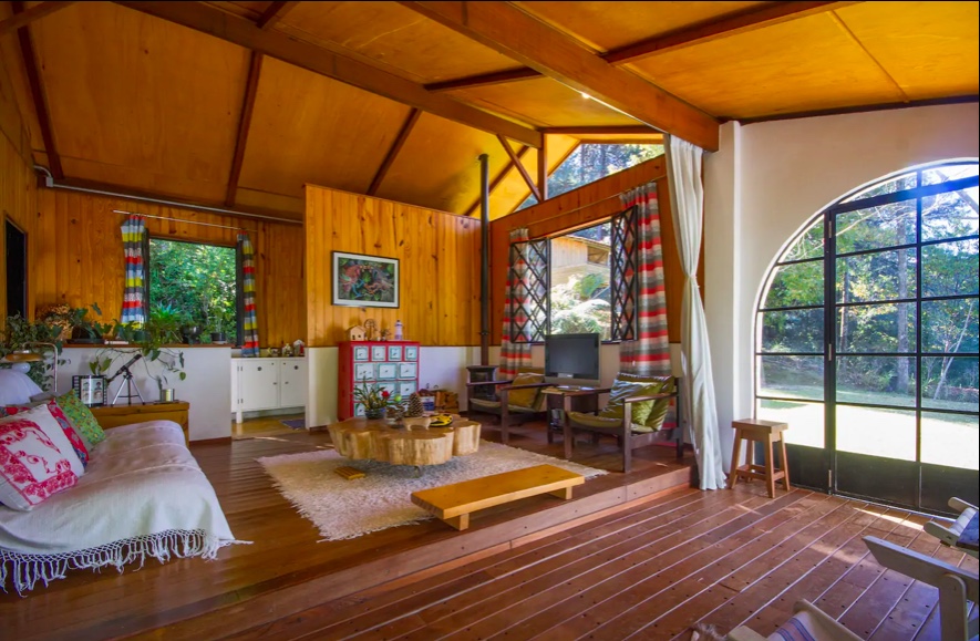 A vista panorâmica desta residência vai te encantar! Além de poder fazer uso da horta, pomar, agroflorestal e galinheiro, o espaço é dedicado para o convívio, estudo e leitura. Cinco Cantos foi arquitetado para receber muita luz natural e manter a conexão entre os hóspedes e a natureza mesmo dentro do espaço.