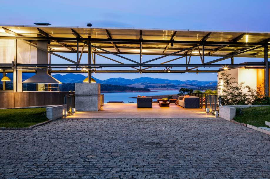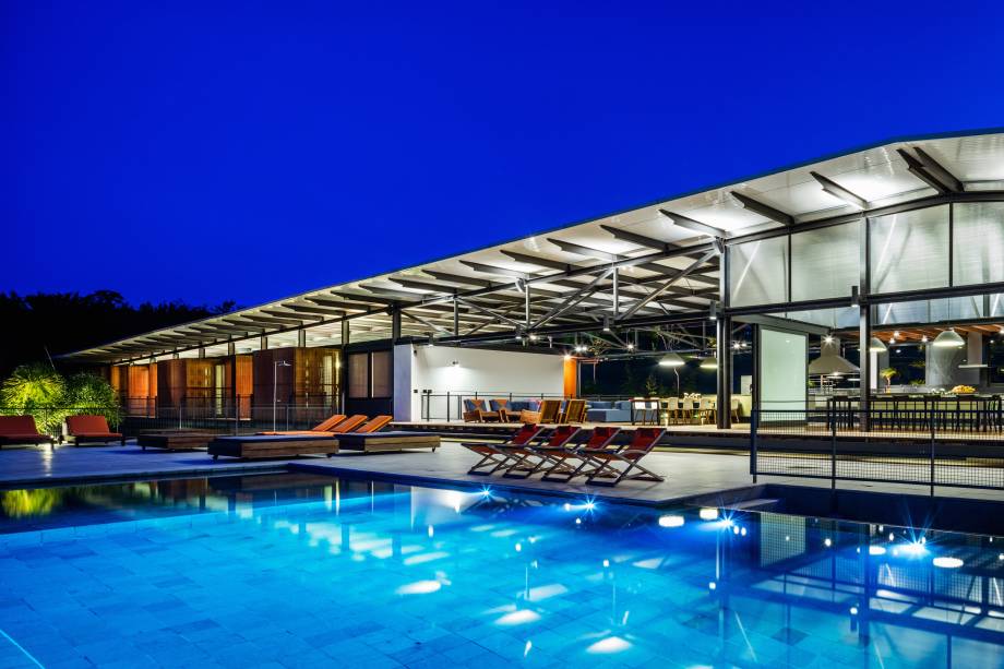 Para permitir que as salas e a cozinha se misturem com a varanda coberta, foram inseridas grandes portas de correr de vidro, que dissolvem os limites entre dentro e fora, cuja casa insiste em romper – quer pela arquibancada de grama que conecta o piso principal ao terreno, quer pela borda infinita da piscina que a une visualmente à represa onde o terreno termina.