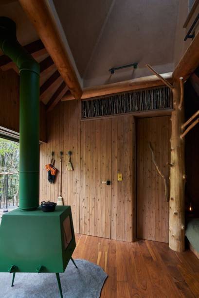 A composição, uma cabana de madeira penetrada por um corniso, junta artesanato, escultura e arquitetura. Instalada a cerca de 2 km de Owakudani, um vale vulcânico no Japão repleto de plumas sulfúricas, a casa na árvore se estende por 19 m² em uma estrutura que se eleva cerca de 5 m acima do solo.
