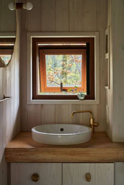 Apesar das limitações de espaço, a construção inclui todas as necessidades e confortos para os moradores. O interior evoca os tons da paisagem envolvente, proporcionando um ambiente acolhedor e intimista. Uma grande janela virada ao sul se abre para a floresta. A luz sublime da clarabóia – formada pelo ponto mais alto da cabana – proporciona uma atmosfera serena em torno de uma lareira feita sob medida, onde os visitantes podem descansar e apreciar a vista.